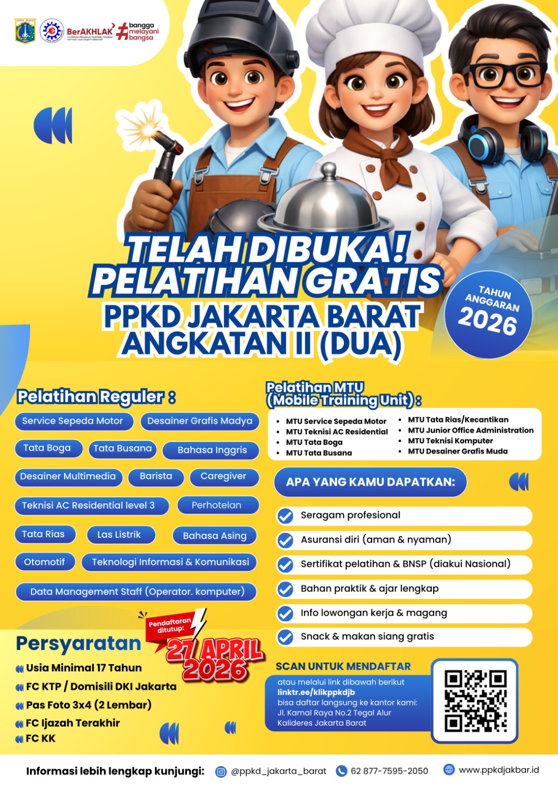 PPKD Jakarta Barat menghadirkan pelatihan GRATIS bagi masyarakat untuk meningkatkan keterampilan dan siap bersaing di dunia kerja maupun wirausaha.